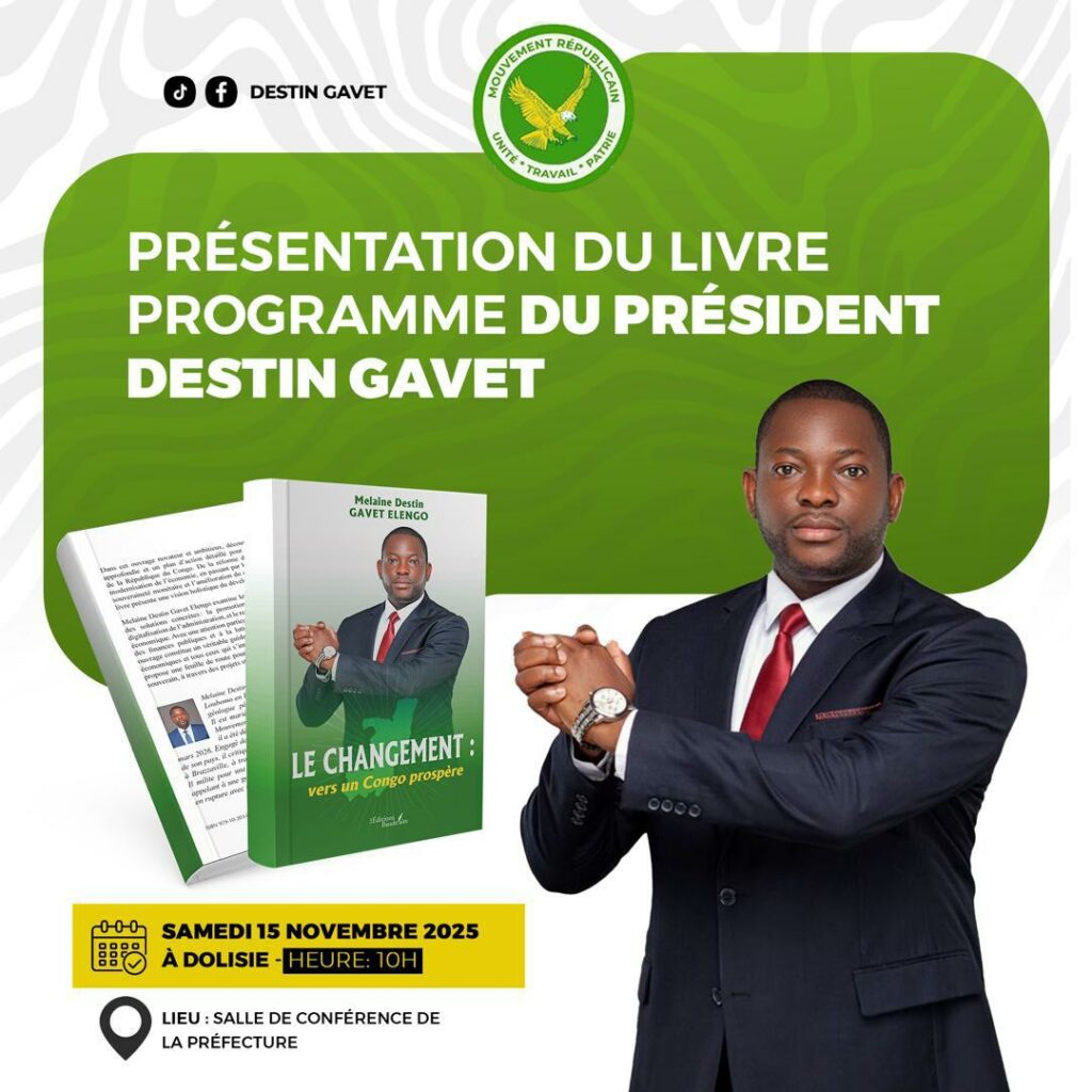 C’est avec allégresse et dans un esprit républicain et patriotique que le Président du Mouvement Républicain (MR), candidat désigné à l’élection présidentielle de Mars 2026, l’Ingénieur Melaine Destin GAVET ELENGO, invite le grand public congolais en particulier et international en général, à être nombreux à consulter cet ouvrage intitulé << LE CHANGEMENT : Vers Un Congo Prospère >>.