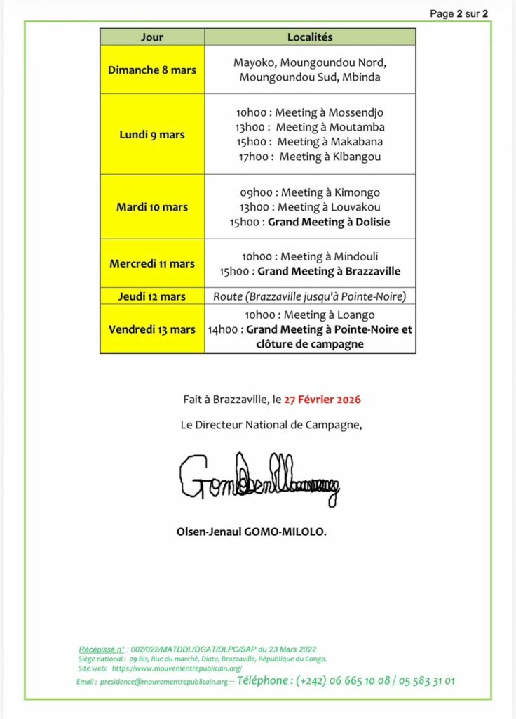 Veuillez trouver ci-dessous, le planning des déplacements dans le cadre du déroulement de la campagne électorale du candidat du Mouvement Républicain (MR), le Président Melaine Destin GAVET ELENGO.