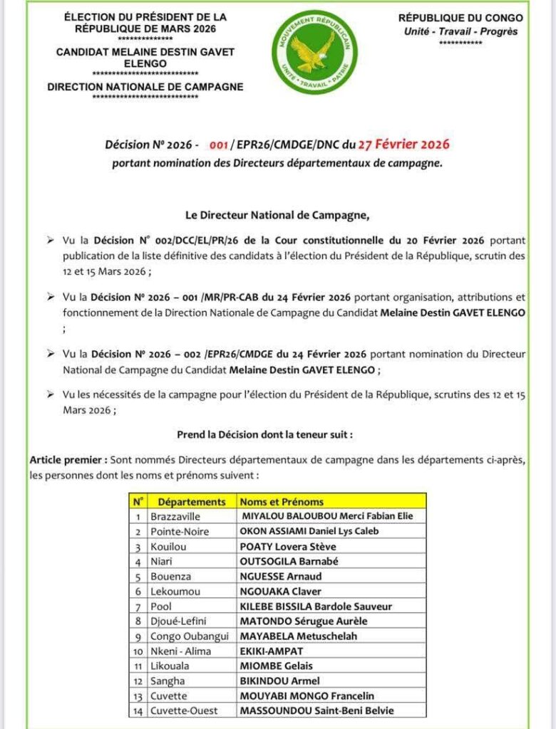 • Décision N⁰ 2026 – 008 /EPR26/CMDGE du 26 Février 2026 portant nomination de Monsieur KOUBAKA Gelvy Delmar , comme Coordonnateur de campagne du Candidat Melaine Destin GAVET ELENGO, en Amérique du Nord.