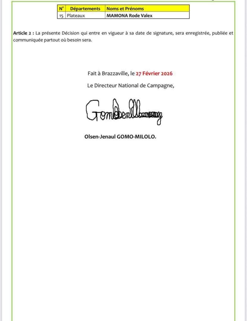 • Décision N⁰ 2026 – 005 /EPR26/CMDGE du 26 Février 2026 portant nomination de Monsieur MPIKA HOUTOU Urbain , Coordonnateur de campagne du Candidat Melaine Destin GAVET ELENGO, en Europe.